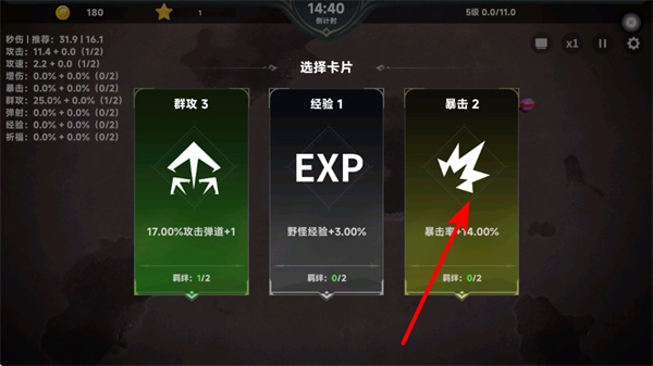 4、选卡时点击暴击+14.00%卡片,可提升角色暴击概率,进一步强化输出效率,助力更快完成关卡目标。