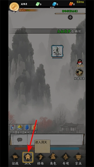 1、进入游戏后点击红色箭头指向的洞天按钮,可进入洞府界面解锁更多功能,这是开启玩法关键操作。