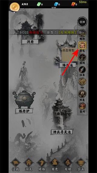 2、在洞府界面中,依照红色箭头指引点击背包按钮,可打开背包查看获得的道具,这是管理资源核心步骤。