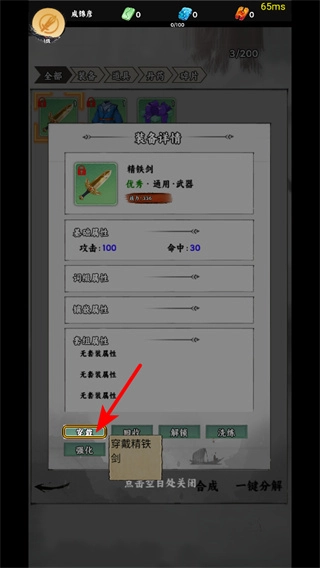 4、在道具详情界面,点击红色箭头指向的穿戴按钮,可穿戴该武器提升角色属性,强化战力关键技巧。