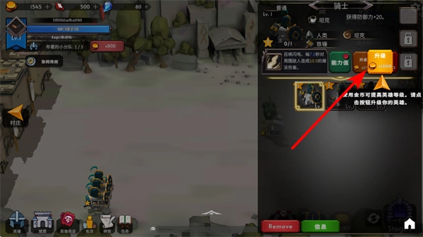3、在单位界面中找到升级按钮,消耗对应金币如500点击它,可提升骑士等级,强化其战斗属性。