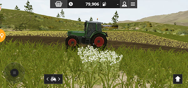 3、这是游戏初期您所拥有的田地之一,田里的小麦已然成熟,是时候进行收割了。您可以使用联合收割机来收割田里的作物,右侧的滑动条是油门,用于控制前进和后退,左侧的方向盘则负责控制左右转弯。
