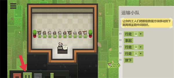 2按要求操作时,需先让员工向下移动一格,接着拿起物品并向前行进两格后放下,随后就能把对应的指令填入右侧的空白区域,务必注意指令的先后顺序不能出错。