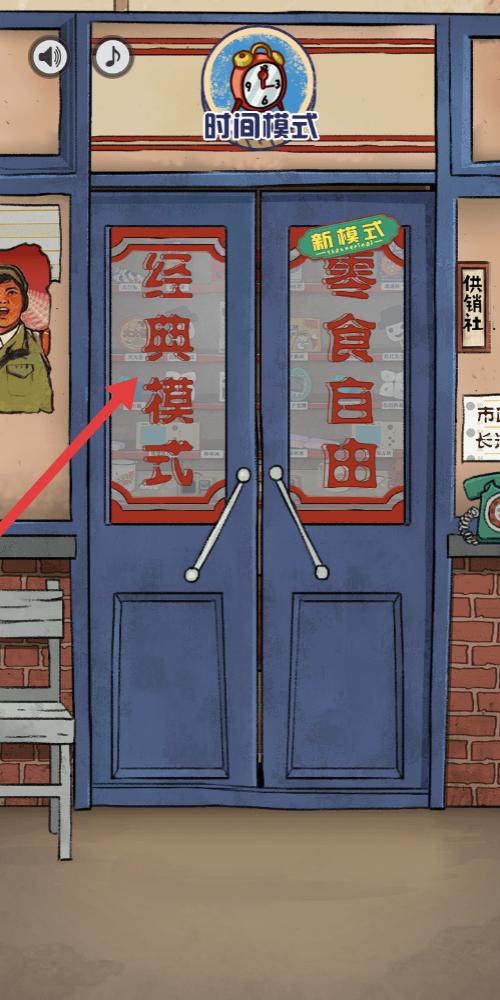 1、游戏界面以复古蓝色双门为视觉核心,分别标注“经典模式”与“零食自由”两大玩法入口;上方的时间模式标识设计醒目,便于玩家快速识别;界面四周还点缀着供销社相关元素,如老式货架、复古海报等,整体营造出浓郁的怀旧氛围,自然引导玩家开启经典玩法的体验。