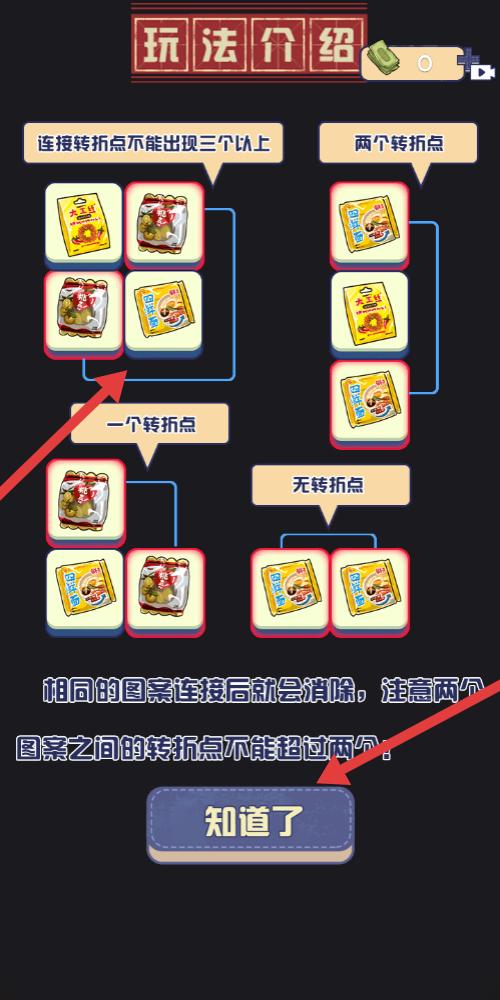 2游戏规则说明直观易懂,借助图形演示同类元素的连线消除逻辑,明确标注路径转折的数量限制,界面底部设有确认按钮供玩家操作,助力玩家迅速熟悉玩法。