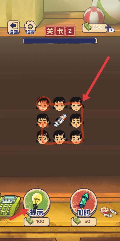 3趣味关卡2的界面里,待消除的角色头像清晰可见,红色线条直观呈现消除路线,底部的提示功能和加时按键作为辅助工具,既能助力玩家突破关卡,又能让游戏的互动感更强。