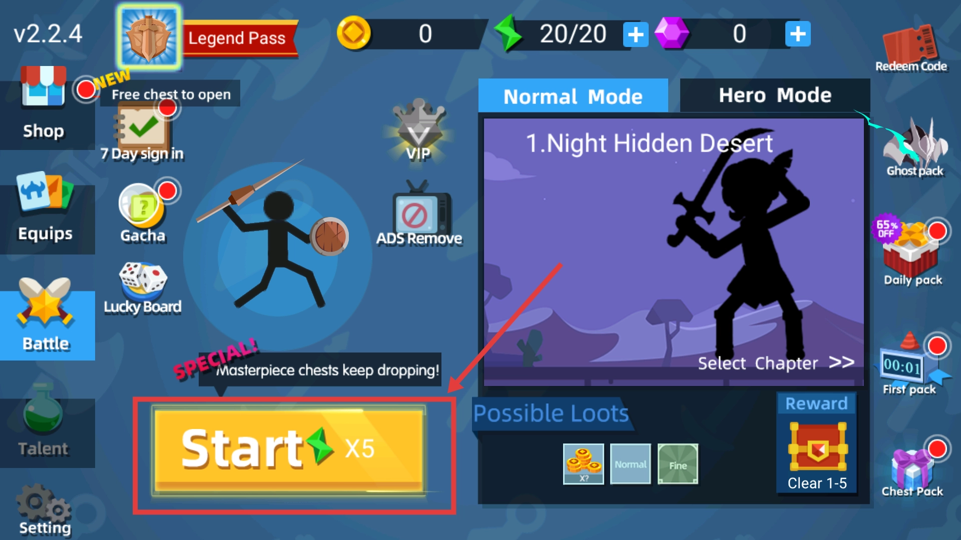 1进入游戏主界面后,点击【Start】按钮,消耗5个绿色宝石,然后在【Normal Mode】模式中选择【Night Hidden Desert】关卡,即可开启挑战。