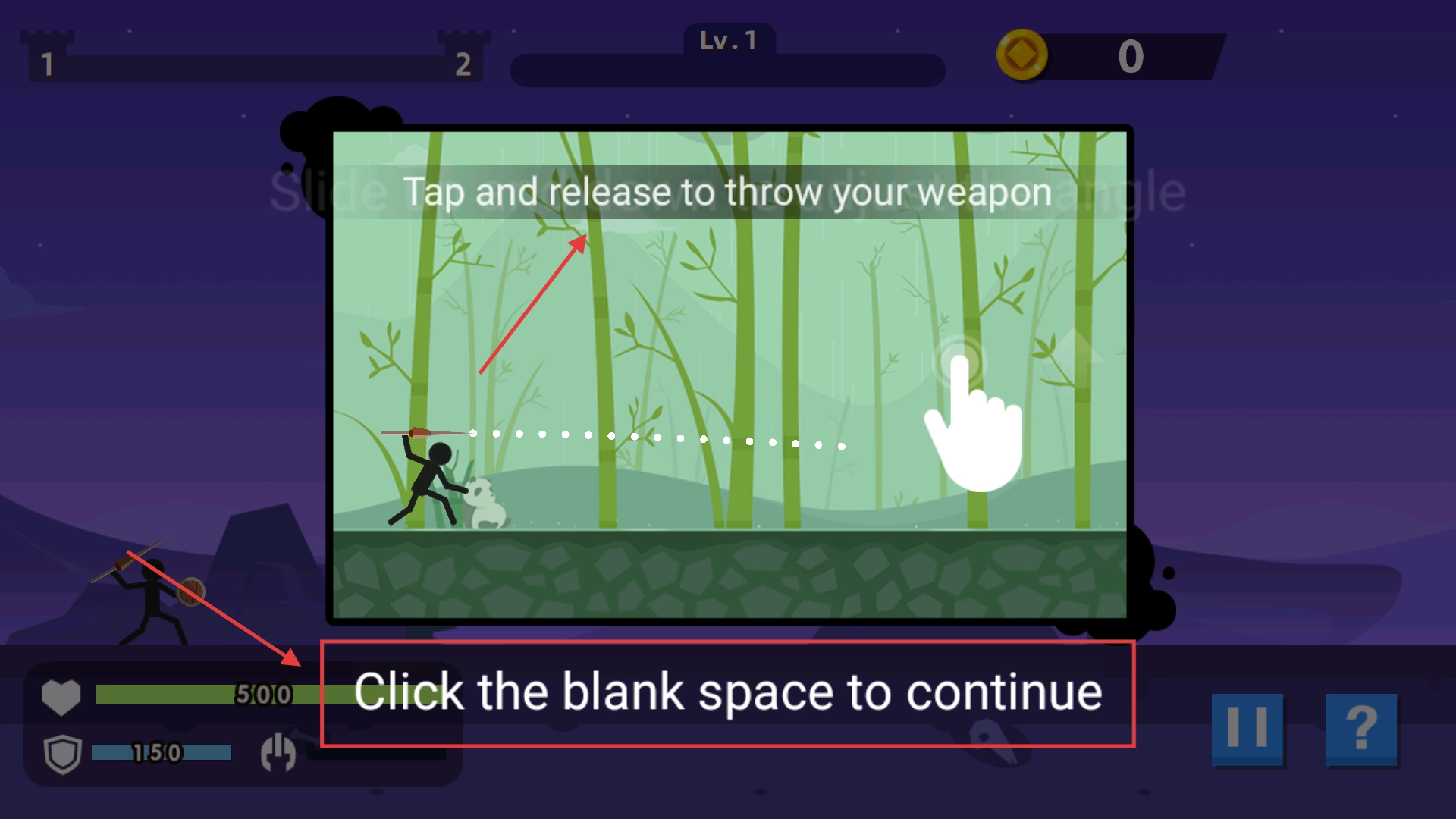 2、在新手教程环节,按照提示点击空白区域以推进引导流程,通过学习【Tapandrelease】的操作方法来投掷武器,从而完成基础射击训练。