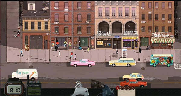 【地图二】(从左至右依次为:披萨店、酒吧、妓院、便利店、热狗摊、汽修厂)