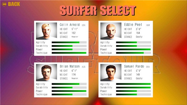 作品里设计了四位具有不同特质的冲浪者,每位都具备独特的参数设定,像平衡、力量这类属性各有差异。作品包含了大量关卡,玩法模式也十分丰富多元,你可以自由选择挑战方式,既能进行单机模式的挑战,也能参与联网竞技。