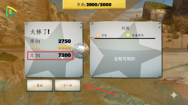 4、测试顺利完成后,查看【总分-7200】之类的数据,点击【下一步】按钮,就能进入下一关继续挑战桥梁设计了。