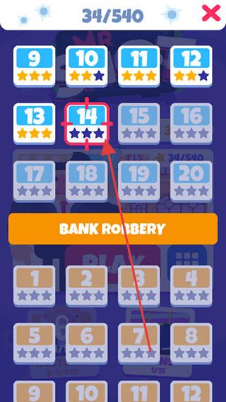 2在游戏内找到“银行抢劫”相关主题板块,从中选定第14个关卡,确认关卡的星级评定是否符合自身挑战要求,若满足条件即可开启该关卡的挑战,以此逐步推进整体的关卡进度。