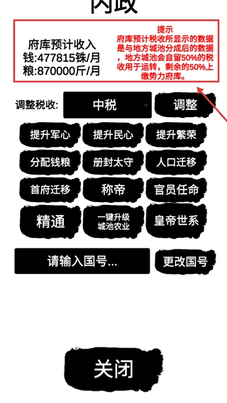 2、关注【府库预计收入钱-477815钱/月】与【粮-8700000斤/月】,调整税收并分配资源,维持内政稳定。