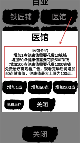 4、医馆提升健康值可选【增加1点-10铁钱】等方式,也能免费治疗看广告,合理分配铁钱资源。