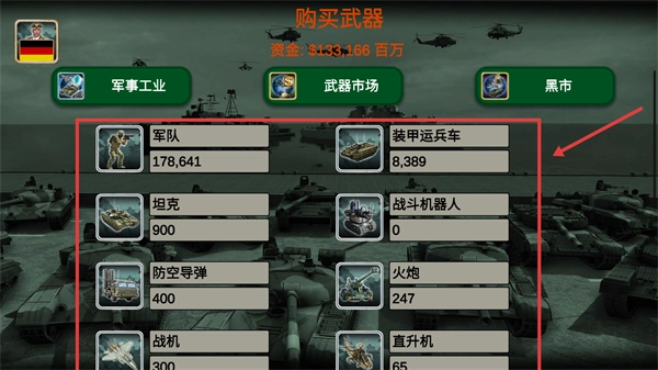 3、进入【购买武器】界面,能够查看当前拥有的军备数量,若需补充装备,可通过【军事工业】-【武器市场】进行操作。