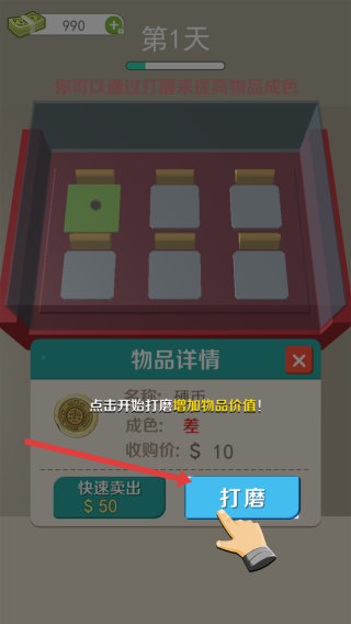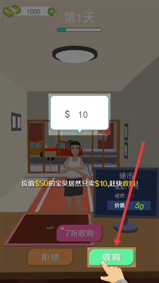 2当顾客拿来的物品实际价值远高于标价时,比如价值50美元却标了10美元,就按照界面箭头的提示,点击那个绿色的收购按钮把它买下来。