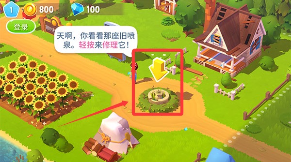 1进入游戏后,我们得先把喷泉修好,轻点一下就能完成维修。