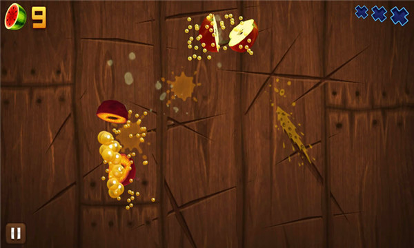 在图标是西瓜的Classic模式里,水果和炸弹会持续出现,游戏时间没有限制。玩家有三次没切到水果的失误机会,一旦切到炸弹游戏就会立刻结束。每攒够100分,之前失去的机会就会自动补充一次。