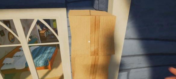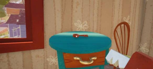 要取的钥匙在隔壁家方向,具体位置是左侧二楼红窗户旁的蓝色桌面上;先在自家一楼卧室拿好纸箱,再到邻居门口左侧的梯子处,把两个纸箱放上去,最后从那里跳到屋檐上。