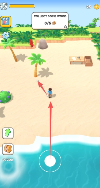 1、点击屏幕中间按钮控制角色移动,优先走向树木等资源点,开启初期资源收集,为后续建设奠定基础。