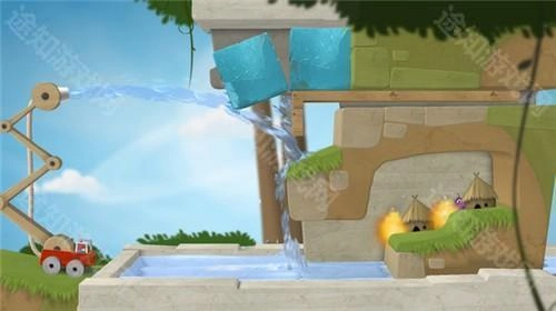 1、使用场景中的机关道具,将水送到火苗所在的地方,达到灭火的目的。