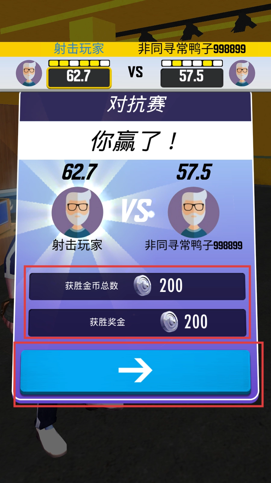 4、比赛获胜后,点击蓝色箭头即可继续挑战新的对手,多与不同玩家切磋交流,不断精进自身的技术吧。