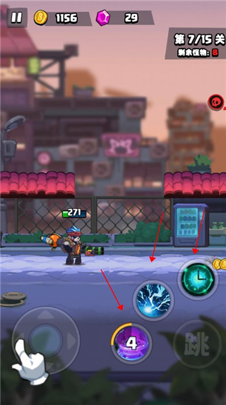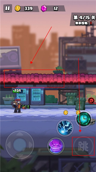3、位于右下角的跳跃键,能帮助我们跳上高台,以此来躲避敌人的攻击。