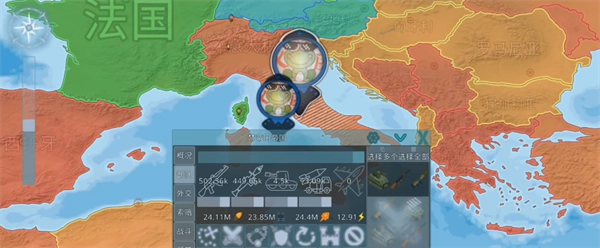 2. 积累足够资源后可以生产陆军、海军等军事单位,通过拖拽部署来攻击相邻的敌方国家球以强制将其吞并纳入版图。
