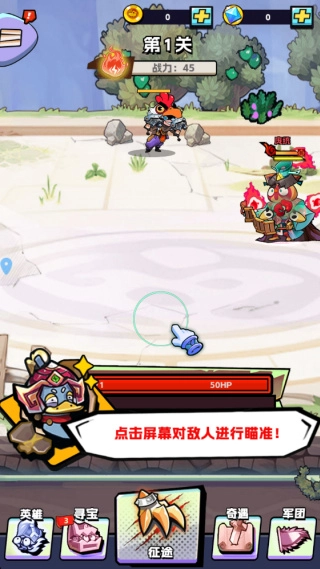 1、点击开始游戏将会直接进入到关卡里,在战场中玩家需要不断的进行点击屏幕才能让角色释放技能对敌人进行攻击;