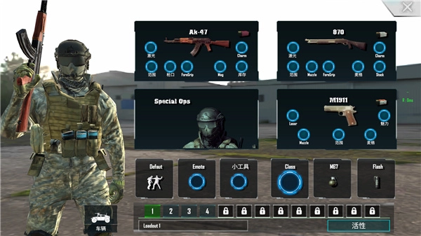 6、进入到关卡后,就可以开始自由的配搭装备了,一个玩家可以带两把武器进入战场里;