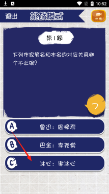 2、仔细阅读题目内容,逐一分析各个选项,判断作家笔名和本名之间的对应关系,选择正确答案来推进答题流程,从而体验文学知识考查类的玩法。