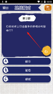 3、查看新题的思考内容,围绕脊椎动物牙齿相关问题,挑选正确选项来完成答题挑战,亲身感受科普知识的考查机制。