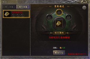每件装备设有三个铭文镶嵌位,解锁第一个位置需消耗五万传奇币,第二个位置需使用一枚打孔石,第三个位置则需要三枚打孔石。