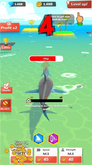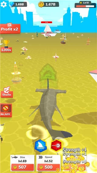2、可对鲨鱼进行升级操作,以此获得更强大的鲨鱼。