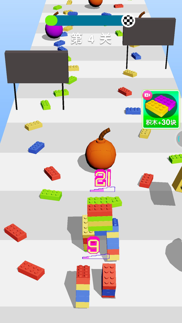 1、通过左右滑动来操控角色的方向,当角色吃到地图上的木板时,木板就会被收集到角色手中。