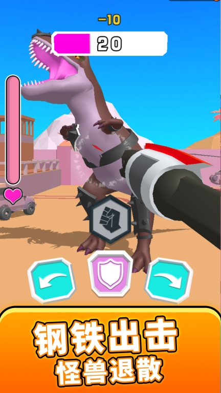 1、通过滑动虚拟按键来操控机甲施展刺戳与拳击动作,点击躲闪按钮规避敌人攻击,与怪兽展开正面交锋。
