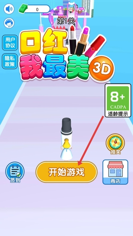 1、进入游戏初始界面后,点击界面上醒目的橙色“开始游戏”按钮,就能进入第1关,开启以口红为主题的游戏挑战。