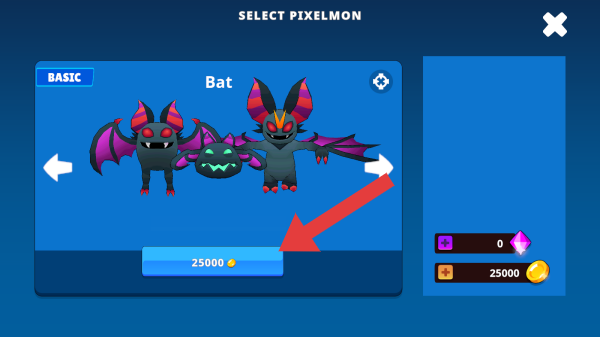 2、展示Bat精灵,并提示可花费25000金币购买该精灵,玩家可依据提示完成相应操作。