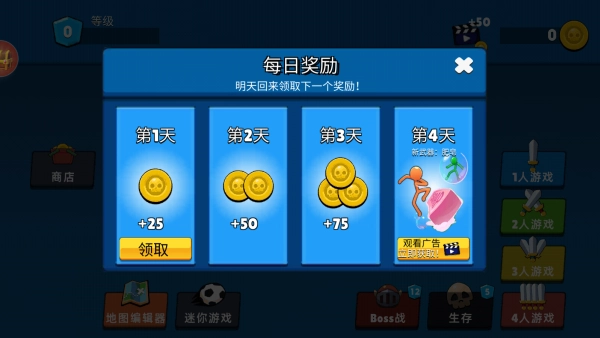 1、每天登陆领取金币奖励,数量随着天数逐渐递增,可以用于解锁角色。