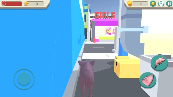 1、滑动左侧的虚拟摇杆来操控小猪移动,以小猪的视角去观察和探索整座城市;