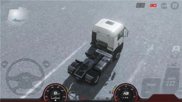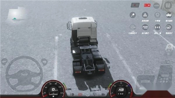 2、点击右上角的菜单,接着点击左侧的钥匙图标来启动卡车,之后就可以通过踏板进行操作了——方向盘对应坐标,右侧是刹车和油门,而前进挡与倒挡则位于油门的上方。