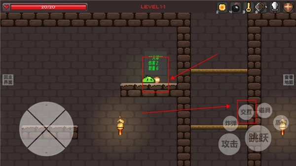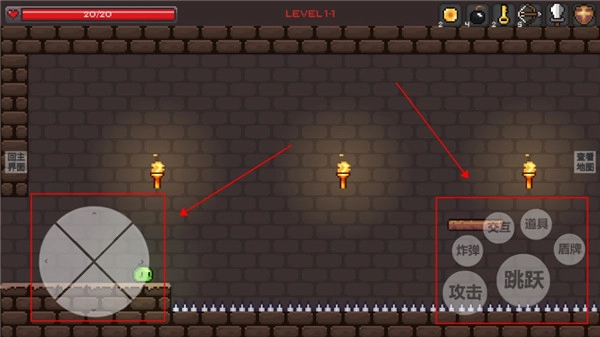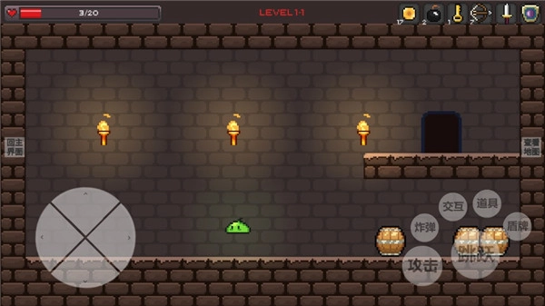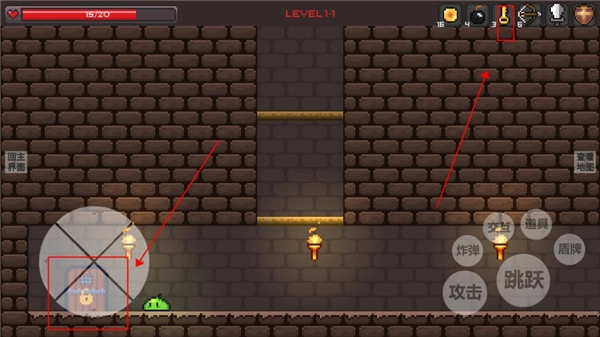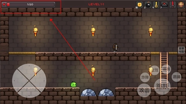 7、屏幕左上角显示的是你的血条,当血条数值归零时游戏便会结束。你可以通过击杀小怪或者打破箱子来获取回复药水。