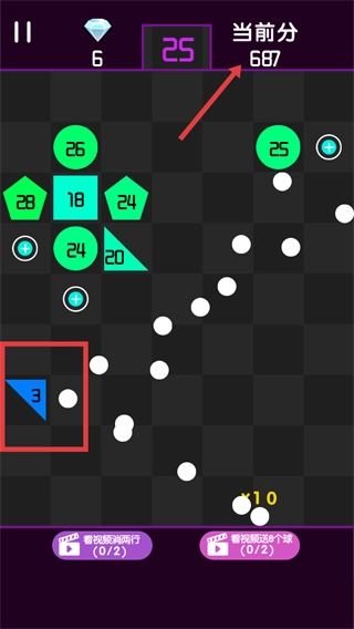 3、操控弹珠撞击数字方块,累计得分至【687】,推进游戏进度。
