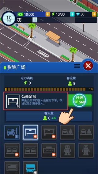 1、影院广场升级【公交站台】需消耗【568】金币,此举可提升客流量,吸引更多电影爱好者,助力前期顾客增长。