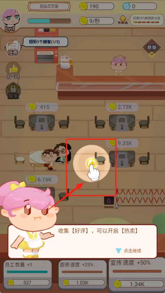 1、升级厨师速度与员工数量,缩短甜品制作周期,提升单位时间接待量,快速积累初始资金。