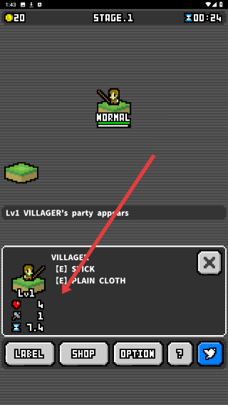2、在Stage-1阶段,需查看“Lv1-VILLAGER”的相关信息(其装备为STICK与PLAIN-CLOTH),随后点击箭头所指向的区域,以此触发村民事件,从而推动关卡进度。