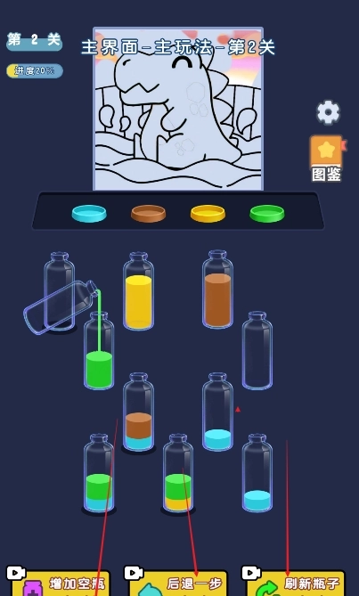 当液体颜色分布杂乱、难以定位可配对目标时,可借助“颜色提示”道具,它会高亮标注出可进行配对的液体所在位置。