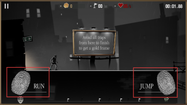 2、闯关时,点击RUN可使角色奔跑,点击JUMP能让角色跳跃,需躲避各类陷阱,向着终点进发。