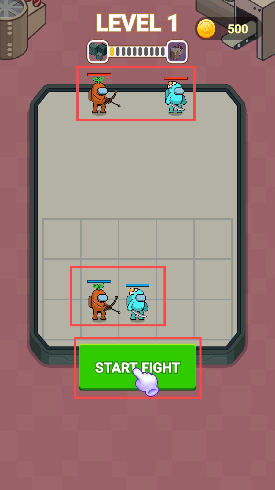 1、进入关卡,点击【STARTFIGHT】按钮,派出下方橙色弓箭手、蓝色剑士,与上方敌人开战呀。