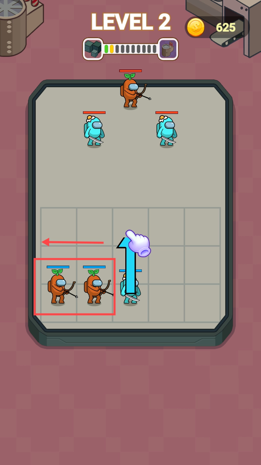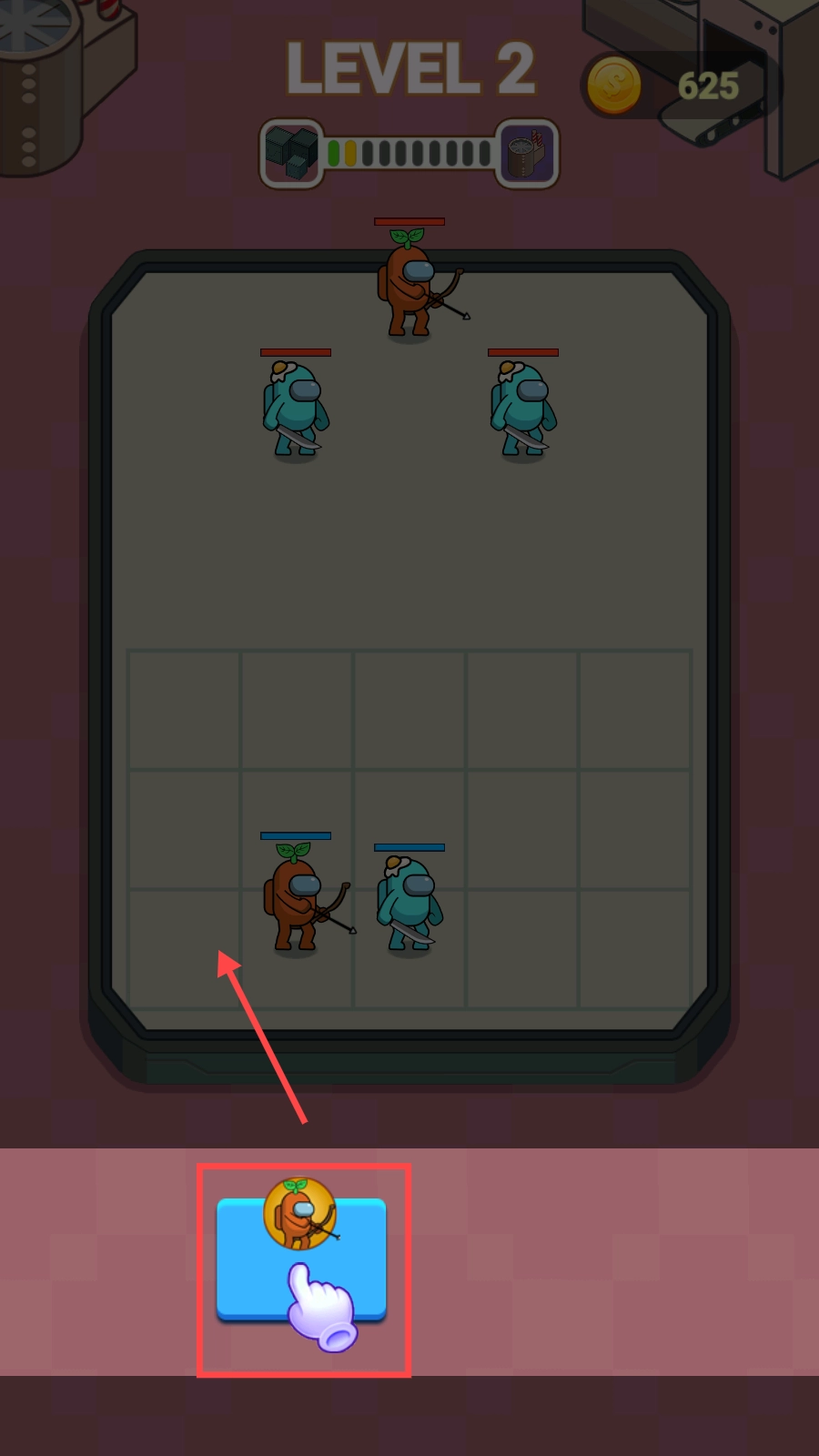 2、到了第二关,点击下方橙色弓箭手图标,将其拖入战场格子,扩充己方战力,应对更强劲的敌人哟。